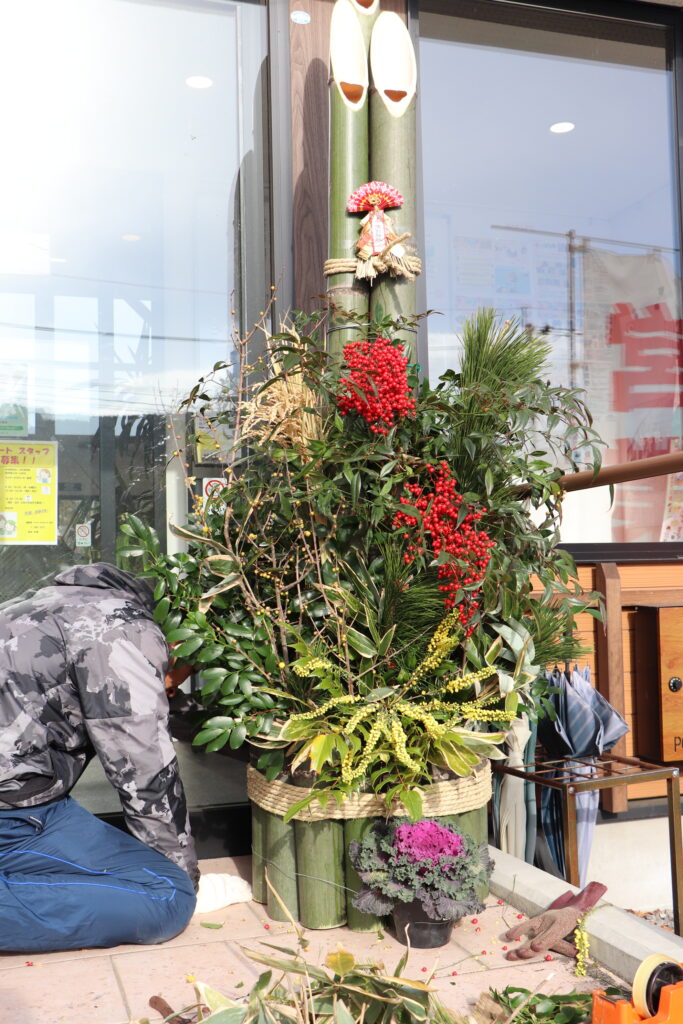松や梅、さかきなど、たくさん準備してくださりみんなで飾り付けをし、