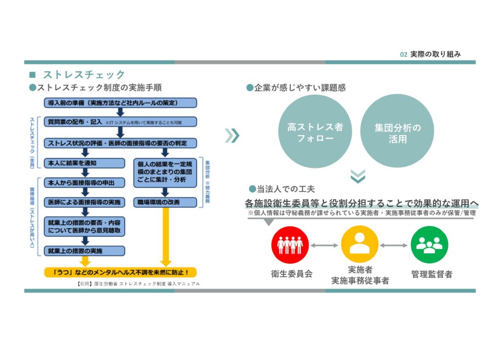 メンタルヘルス活動では、3年前に開設した相談窓口の紹介に加え、高ストレス者へのフォロー体制や、ストレスチェックの集団分析の活用方法など、工夫している取り組みについて発表しました。