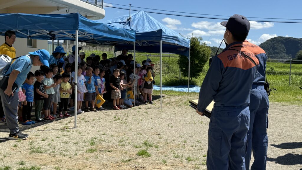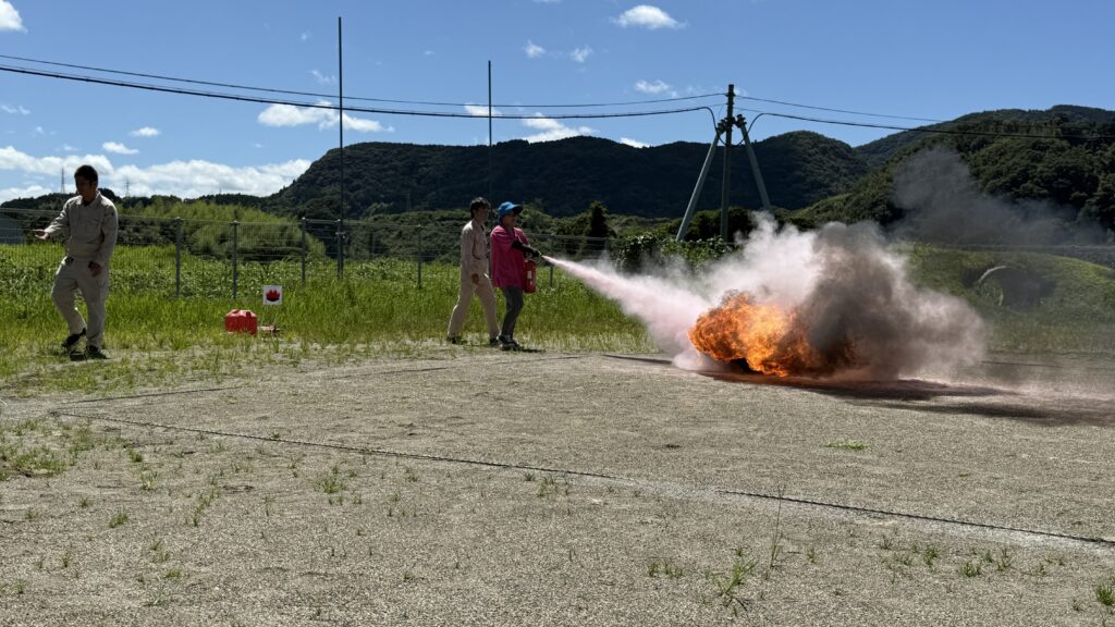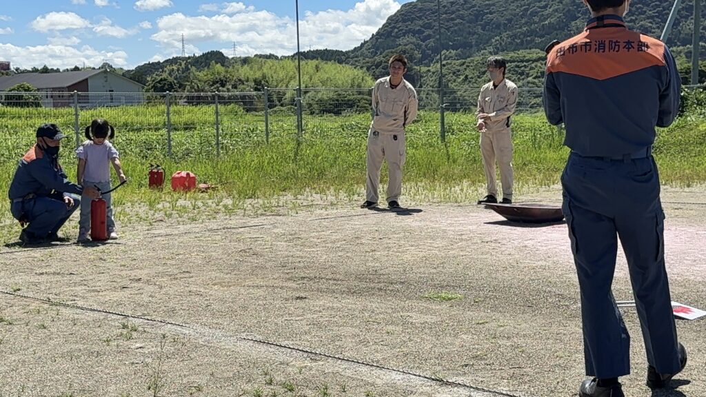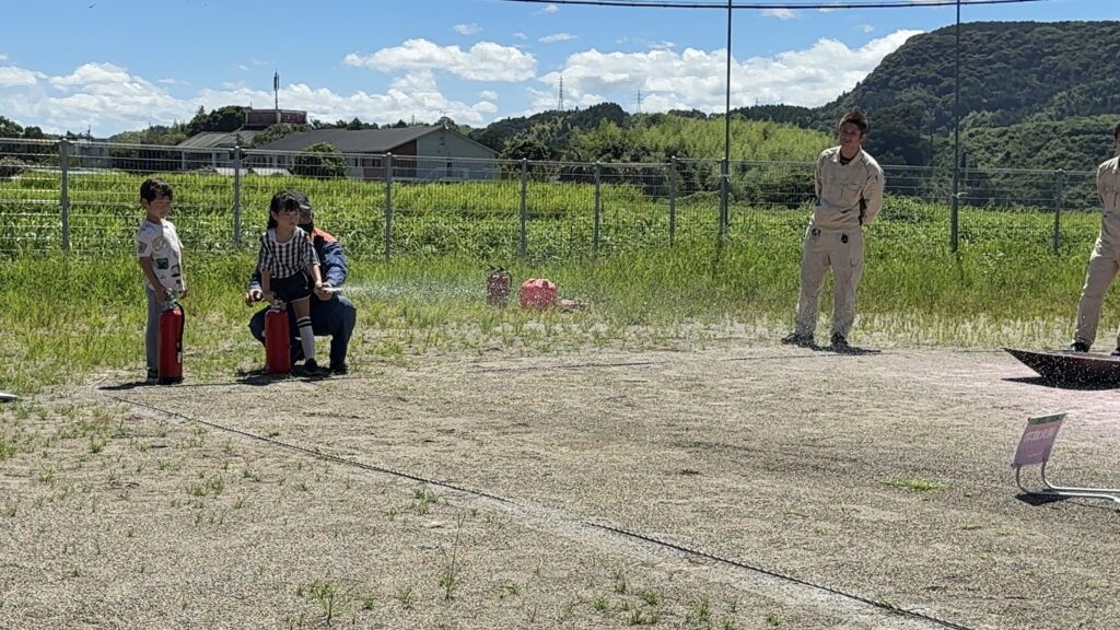 避難完了後は消防士さんより消火器の使い方を教えていただき、先生と子ども達が消火体験を行いました。